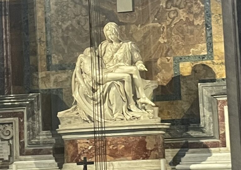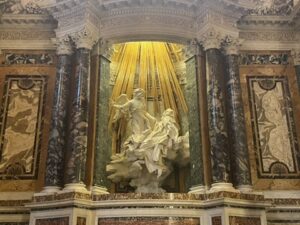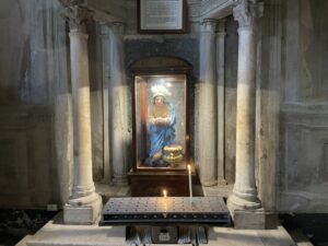 As we attended museums and looked at art this week, one theme I began to recognize was that of the tension between women being both powerful and powerless (in a hierarchical sense). As we looked at Catholic art specifically, (at St. Peter’s Basilica, the Vatican Museums, Basilica San Domenico, and St. Catherine’s Sanctuary), I noticed women in spaces of power. There is a ton of artwork of women in these spaces (especially Mary and female saints) teaching and performing miracles. If they are kneeling or portrayed in a subjugated manner, it is usually towards Jesus. In St. Peter’s Basilica, I noticed that a number of statues of women were placed physically high up in the church, even above some statues of men. I knew that female saints existed, but I previously did not understand the extent to which they have been and are revered (the story of St. Catherine telling the Pope to return to Rome and him complying comes to mind.