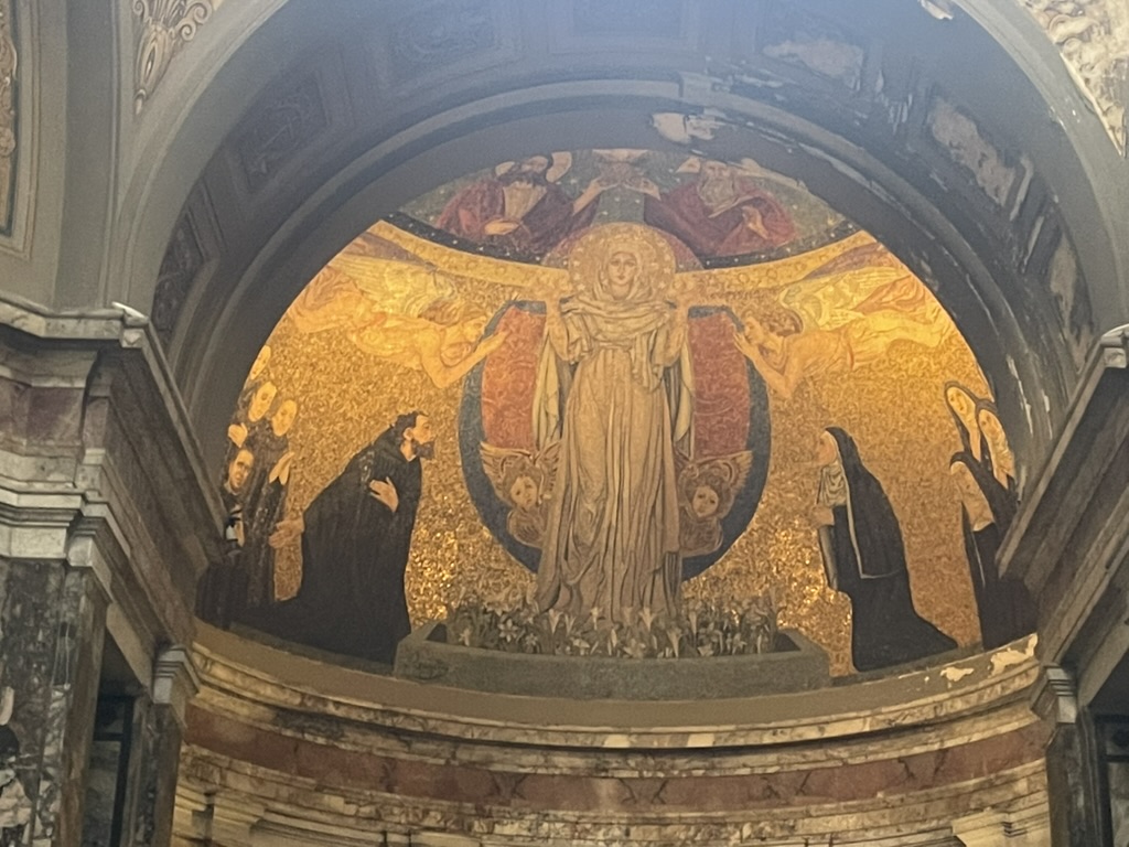 As we attended museums and looked at art this week, one theme I began to recognize was that of the tension between women being both powerful and powerless (in a hierarchical sense). As we looked at Catholic art specifically, (at St. Peter’s Basilica, the Vatican Museums, Basilica San Domenico, and St. Catherine’s Sanctuary), I noticed women in spaces of power. There is a ton of artwork of women in these spaces (especially Mary and female saints) teaching and performing miracles. If they are kneeling or portrayed in a subjugated manner, it is usually towards Jesus. In St. Peter’s Basilica, I noticed that a number of statues of women were placed physically high up in the church, even above some statues of men. I knew that female saints existed, but I previously did not understand the extent to which they have been and are revered (the story of St. Catherine telling the Pope to return to Rome and him complying comes to mind.